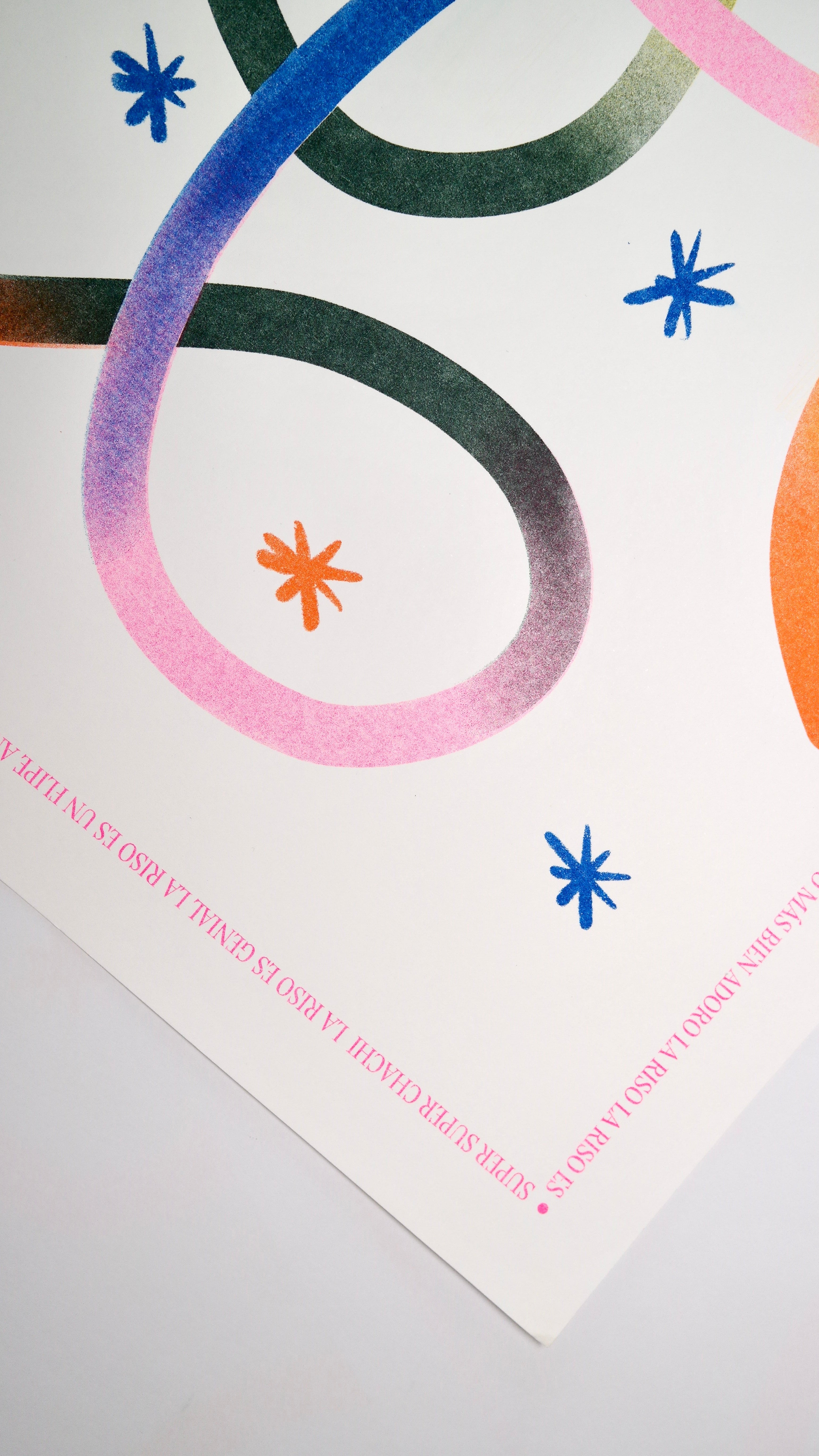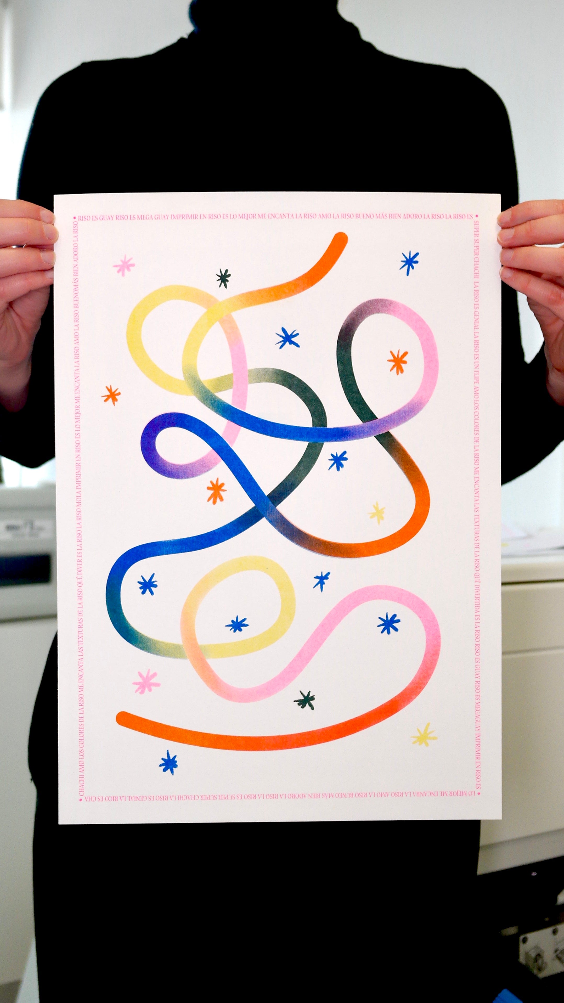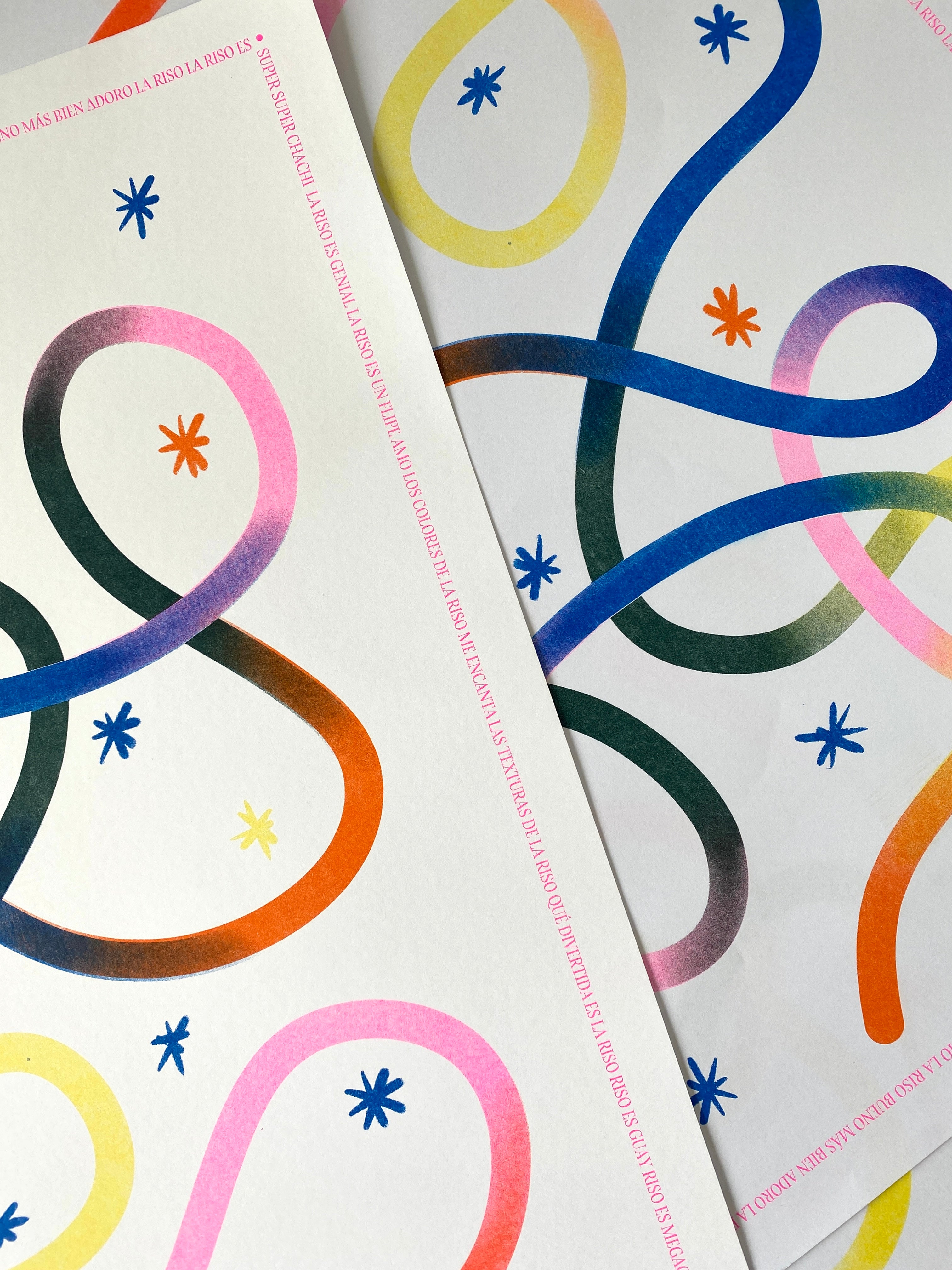 - Impreso en risografía a 5 tintas (rosa flúor, azul, amarillo, hunter green y naranja)
